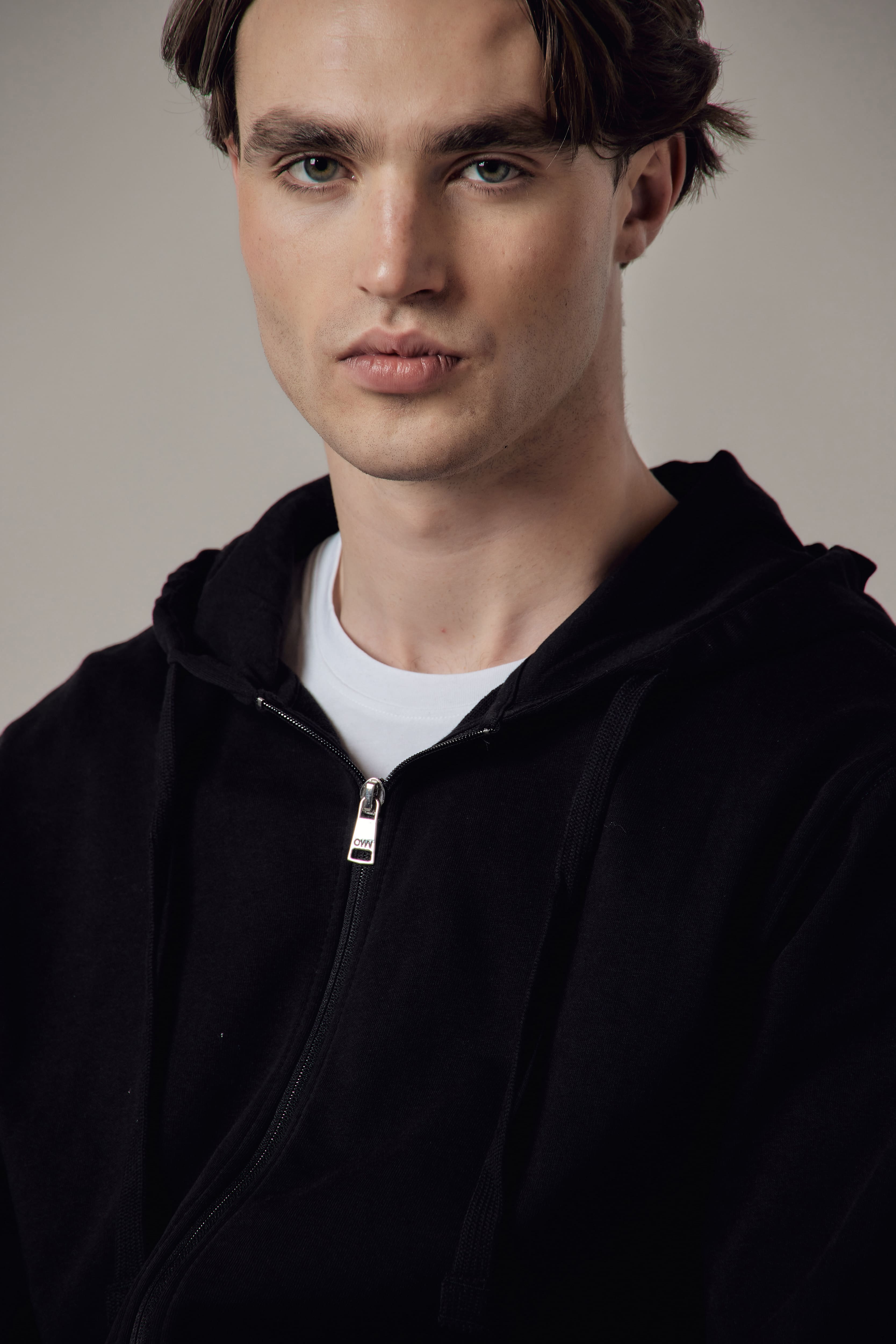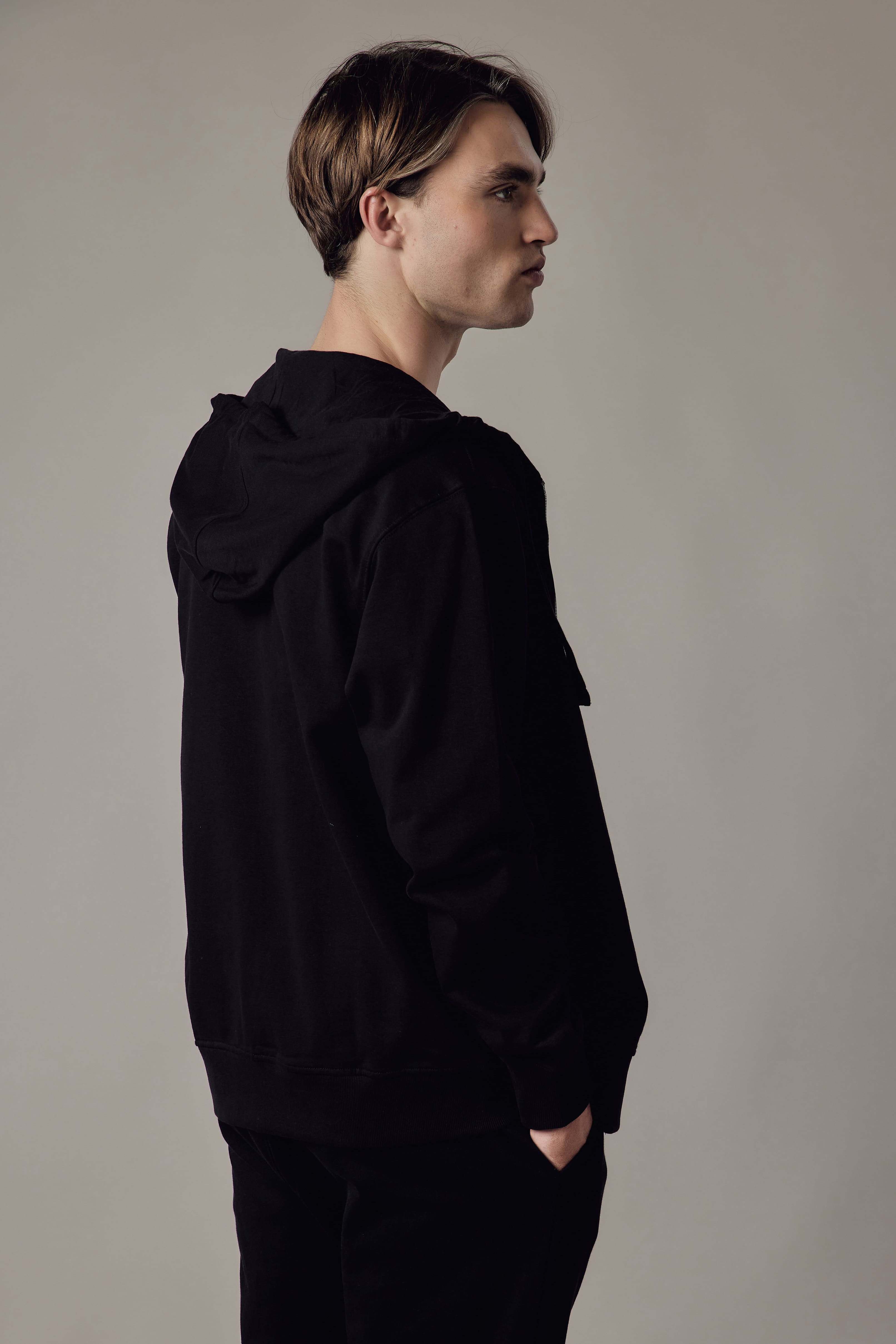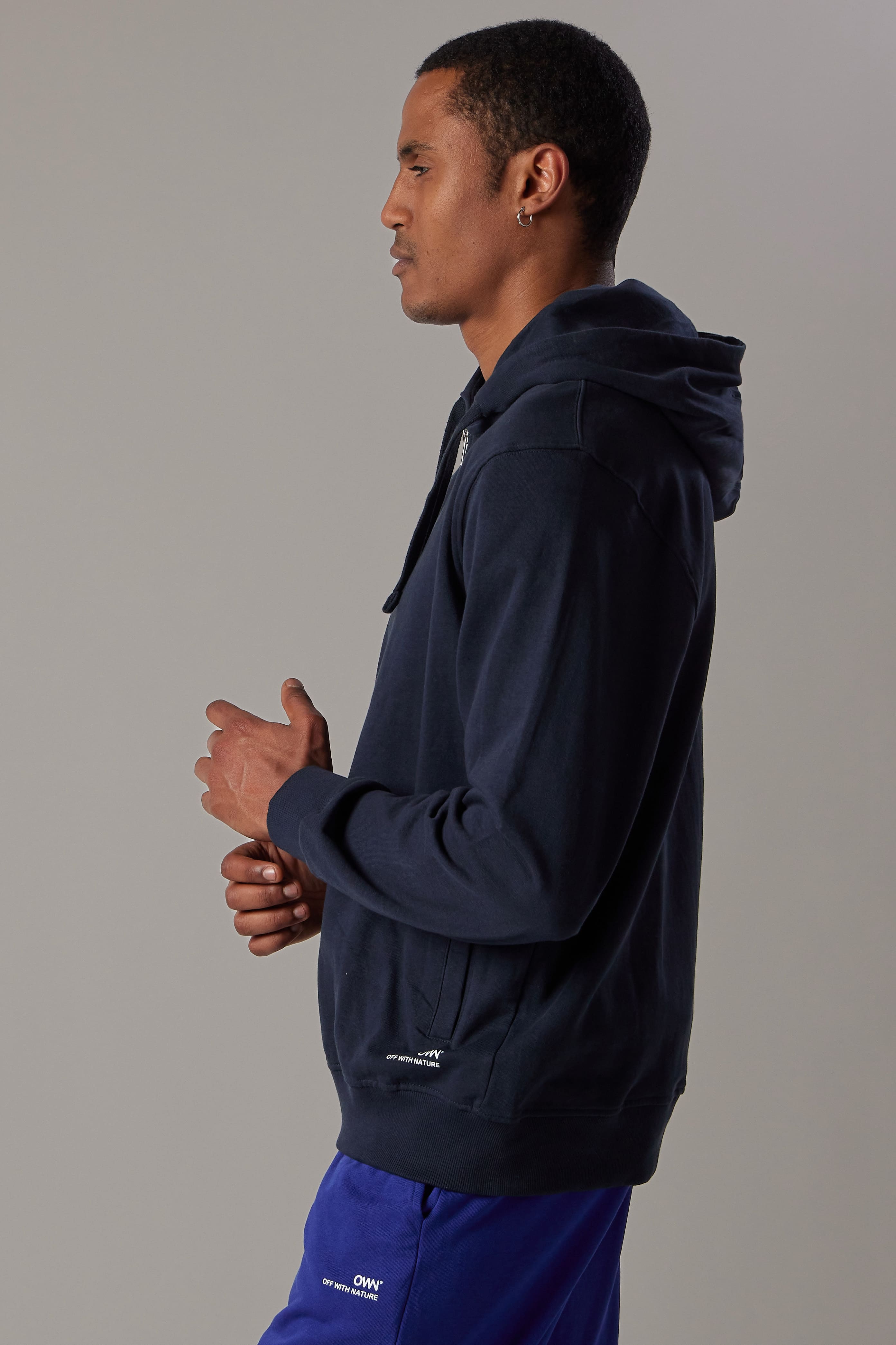Felpa con cappuccio e zip, tasche laterali, fondo e polsini in costina.