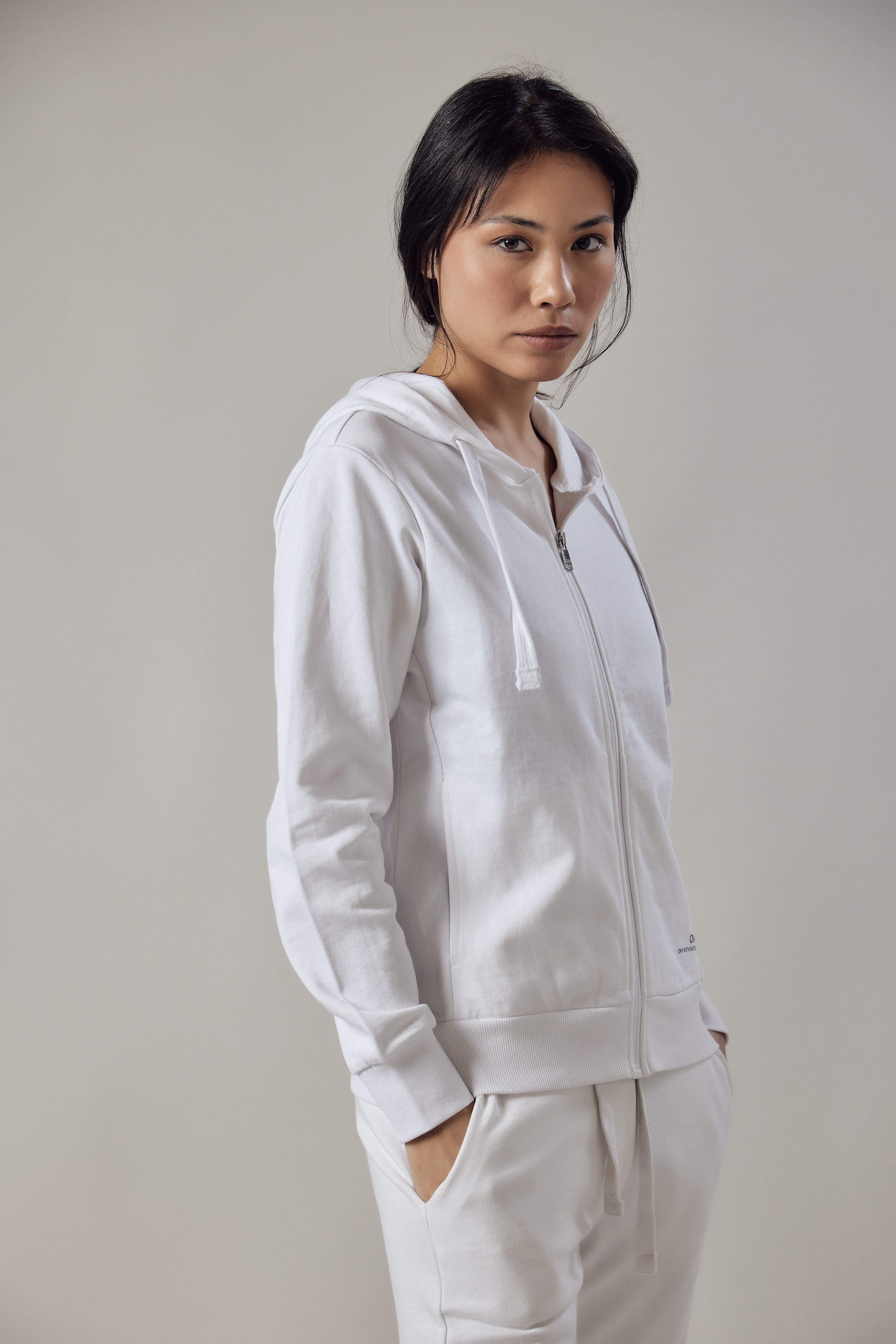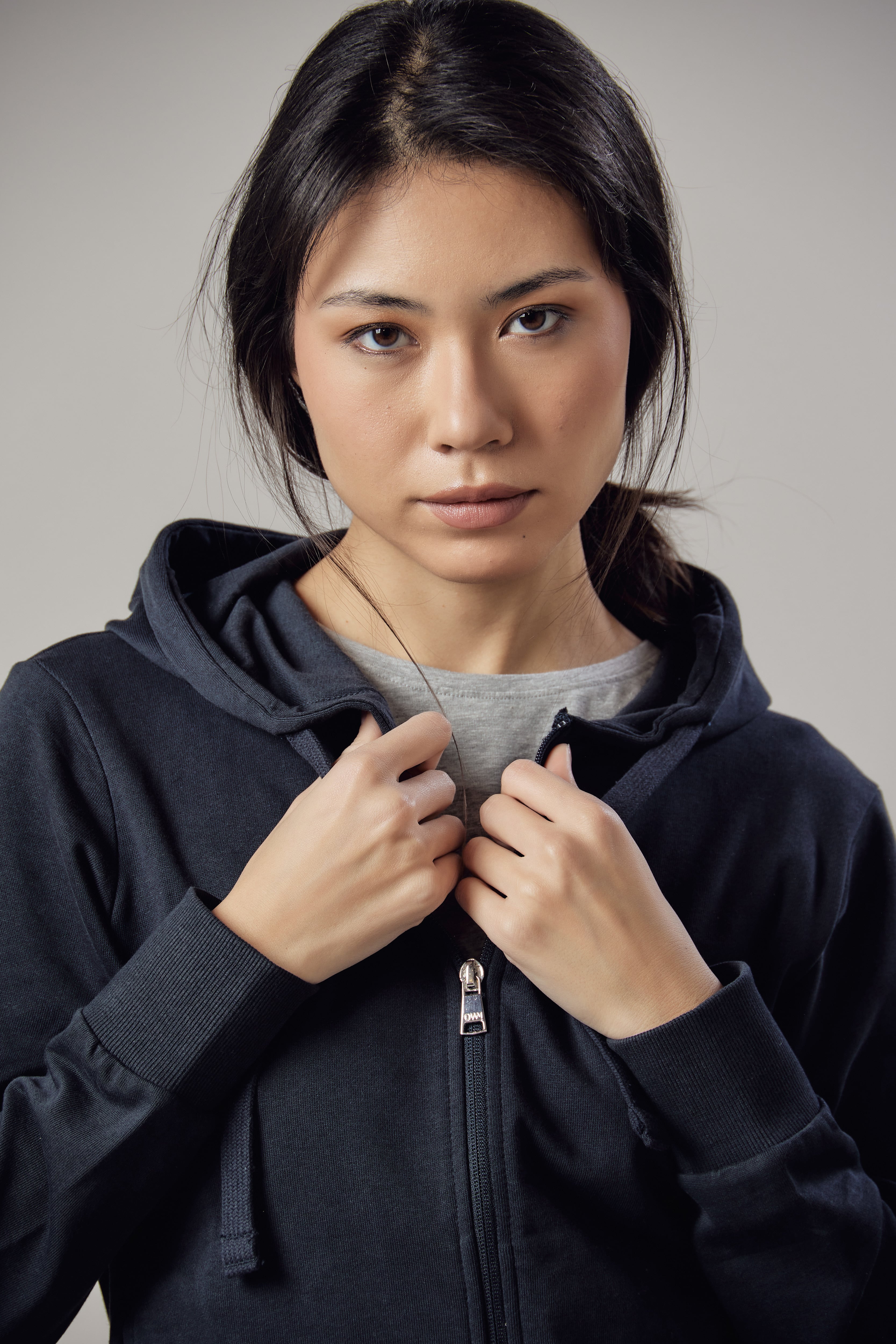 Felpa con cappuccio e zip, tasche laterali, fondo e polsini in costina.