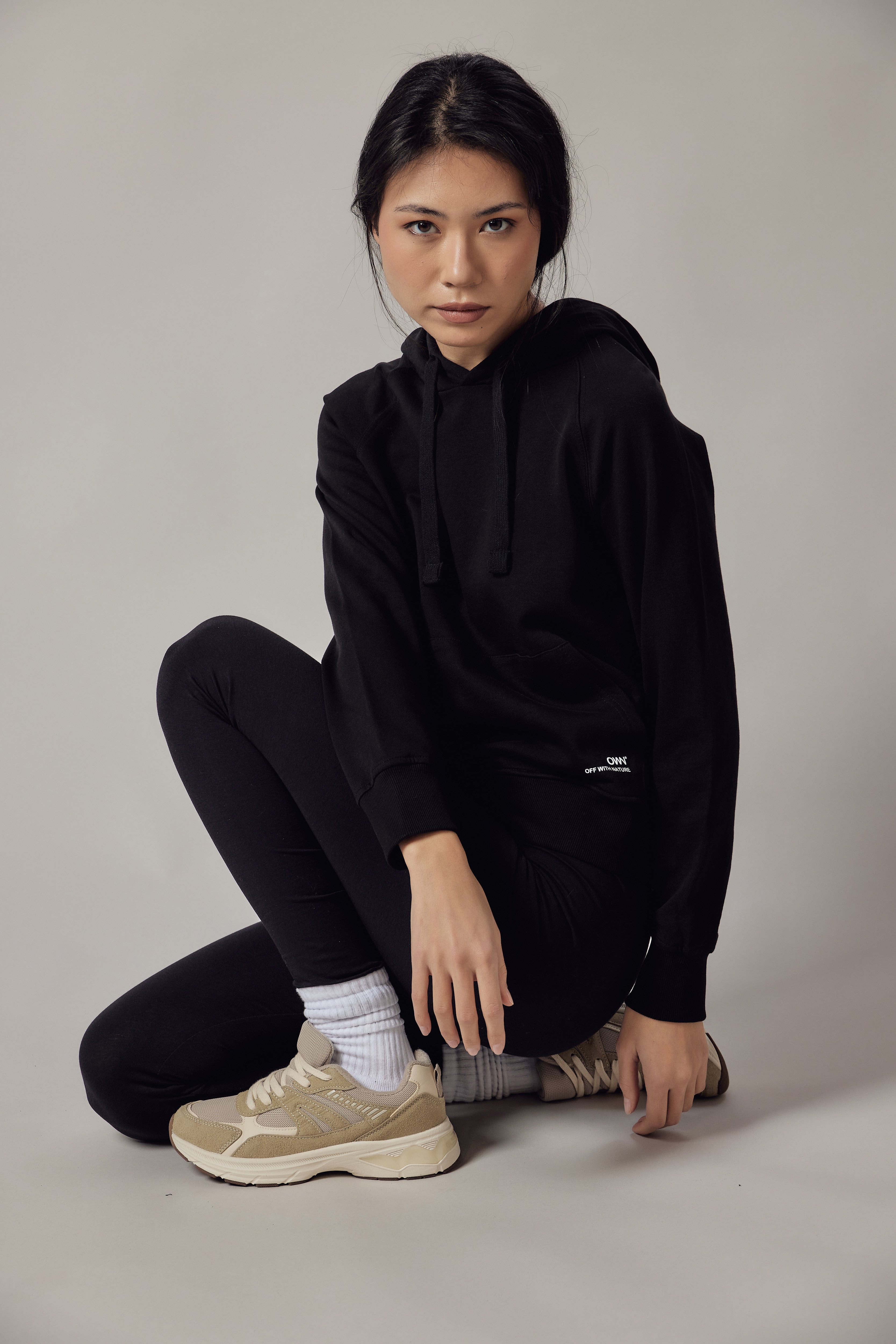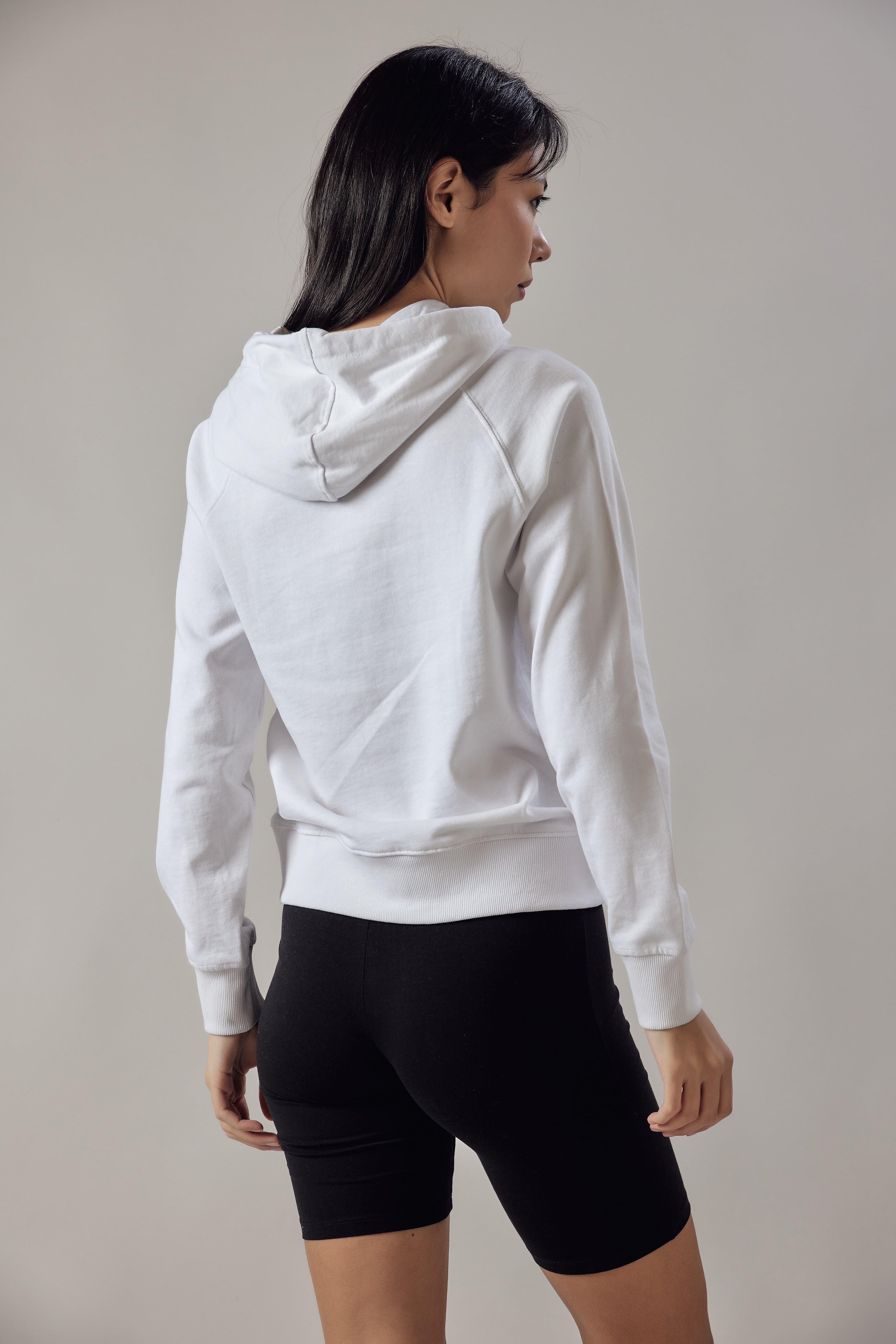 Felpa con cappuccio, tasca marsupio, fondo e polsini in costina.