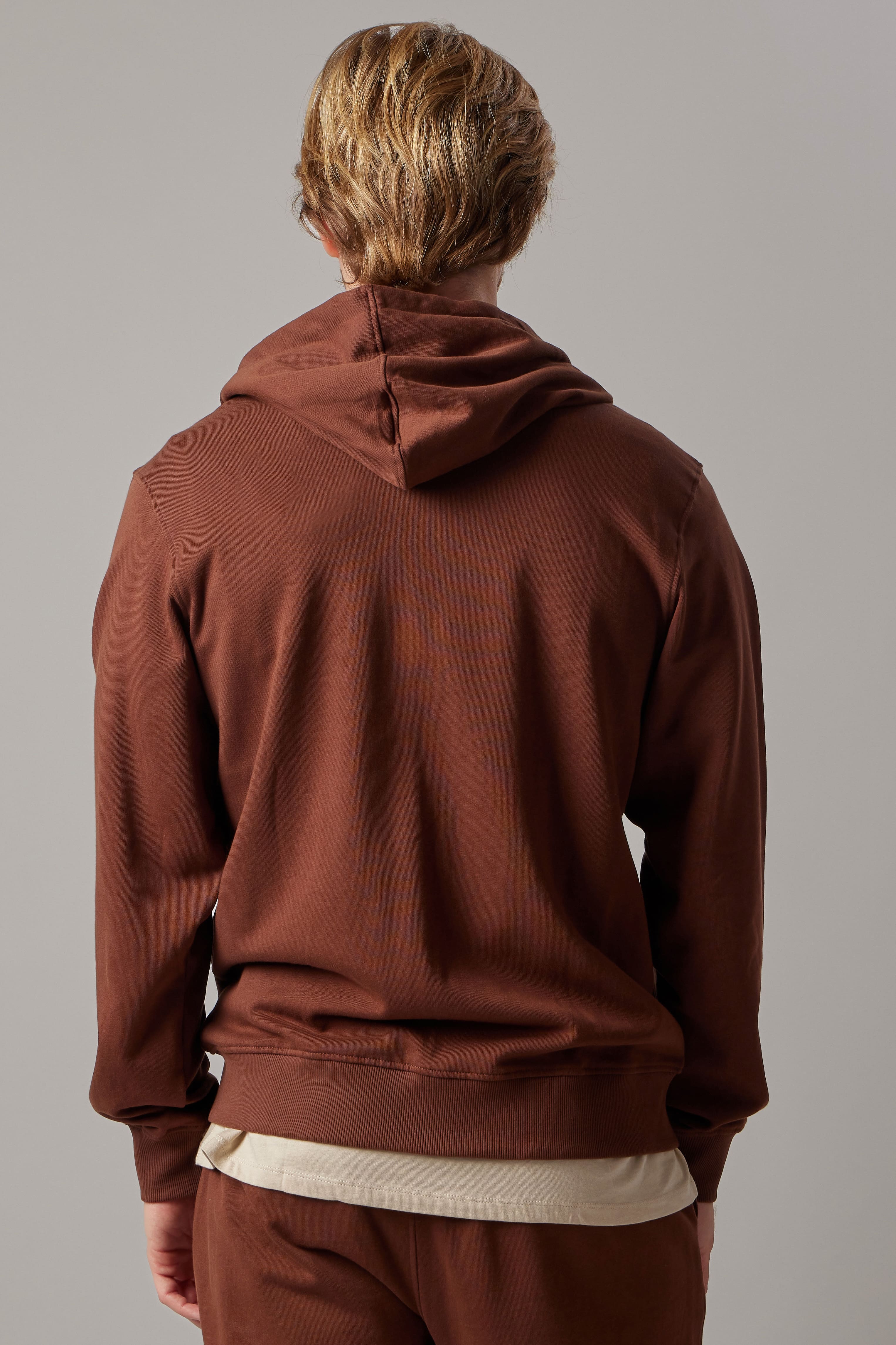 Felpa felpata con cappuccio e zip, tasche laterali, fondo e polsini in costina.