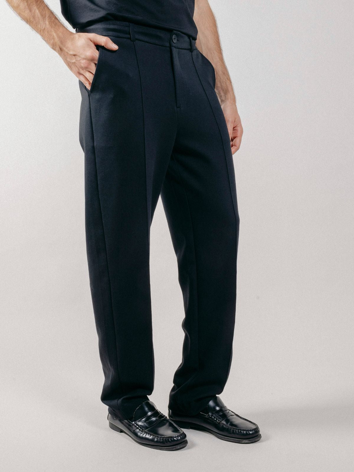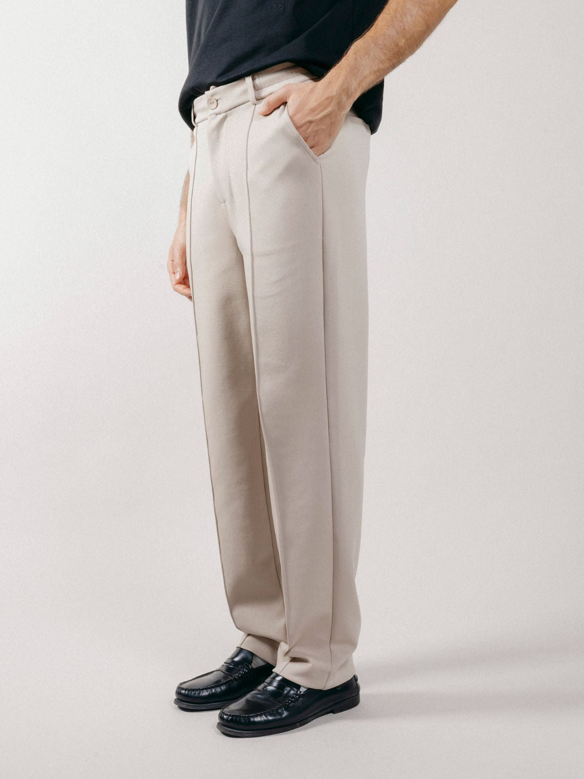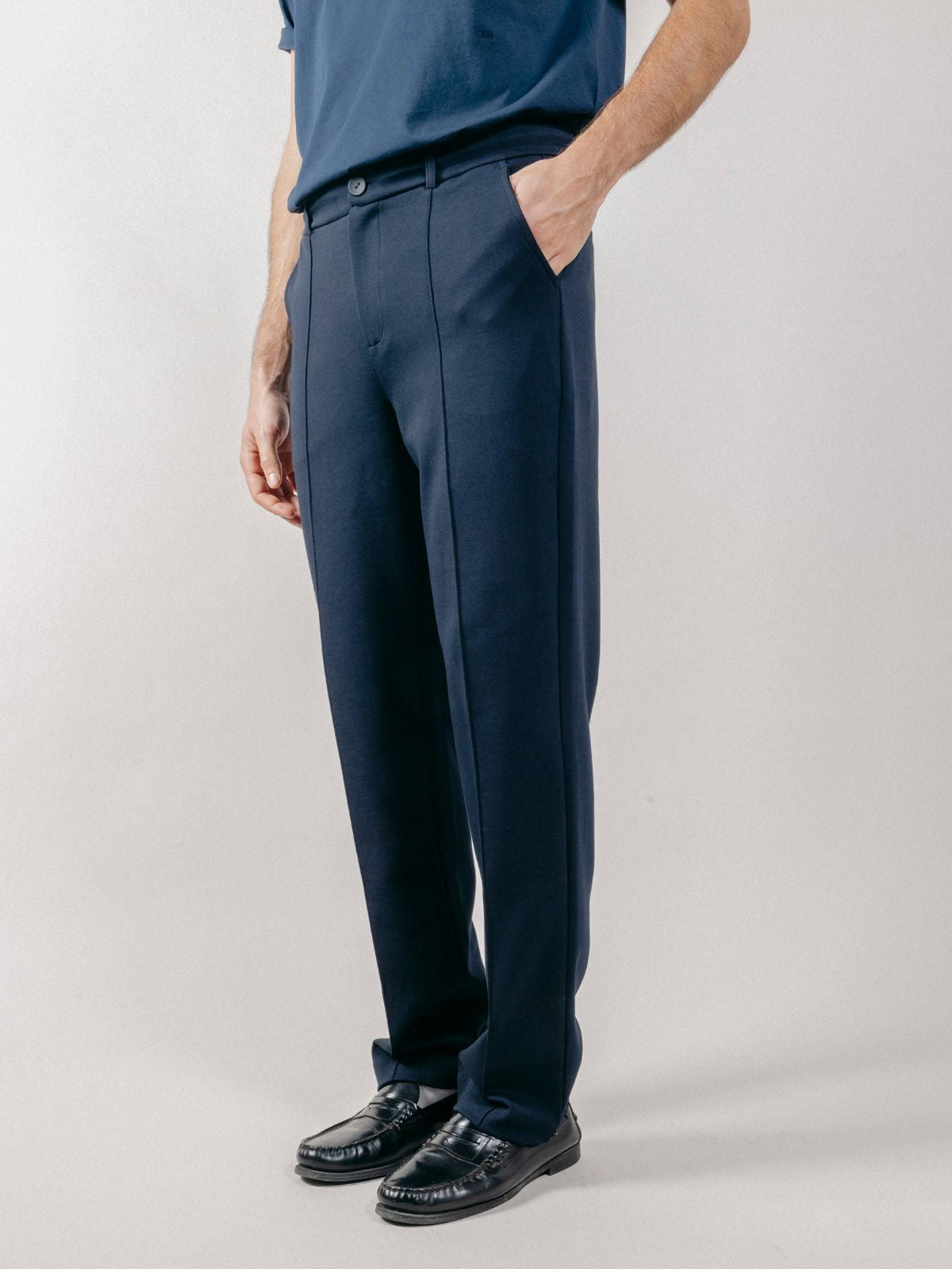 Chino trousers made of interlock with drawstring waist and sewn pleat on the front.