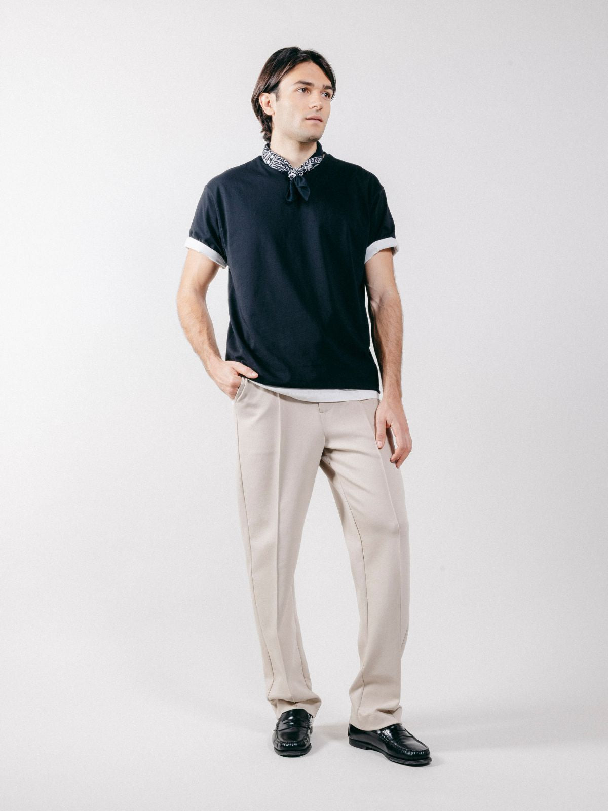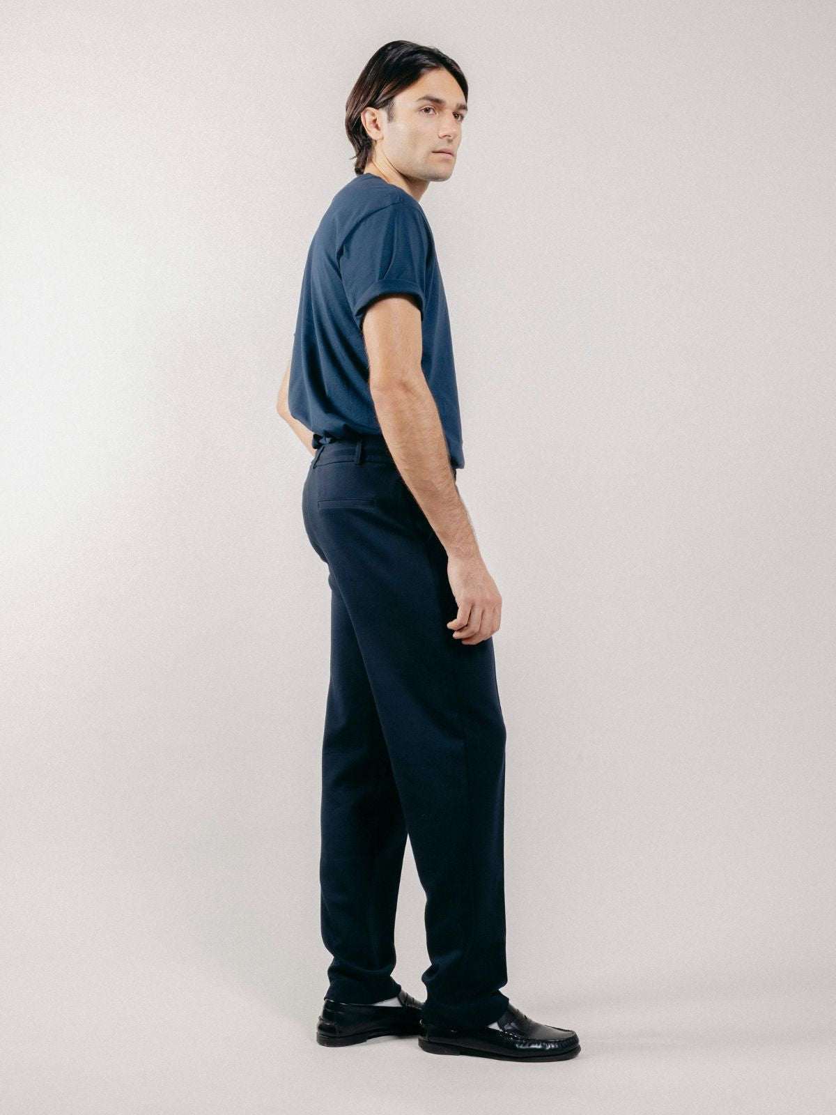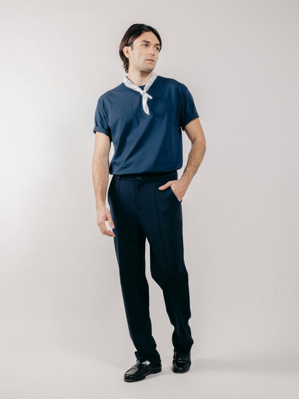 Chino trousers made of interlock with drawstring waist and sewn pleat on the front.