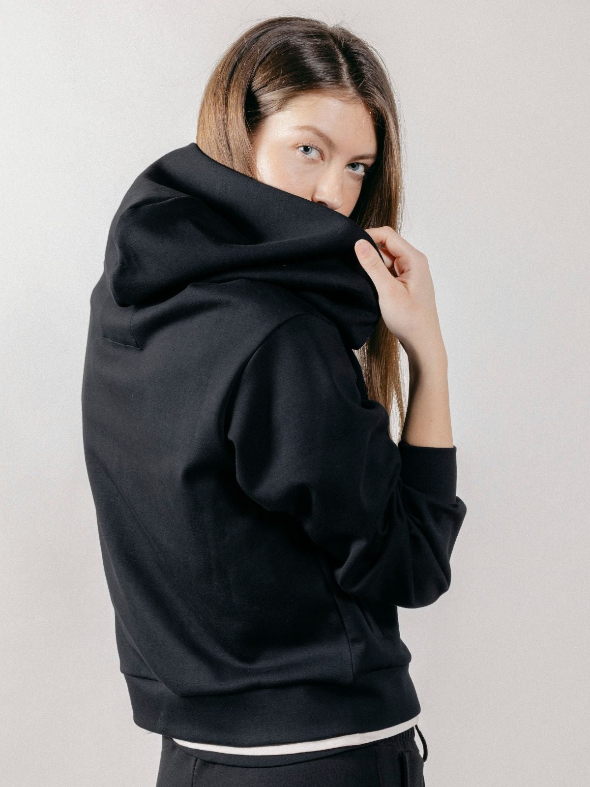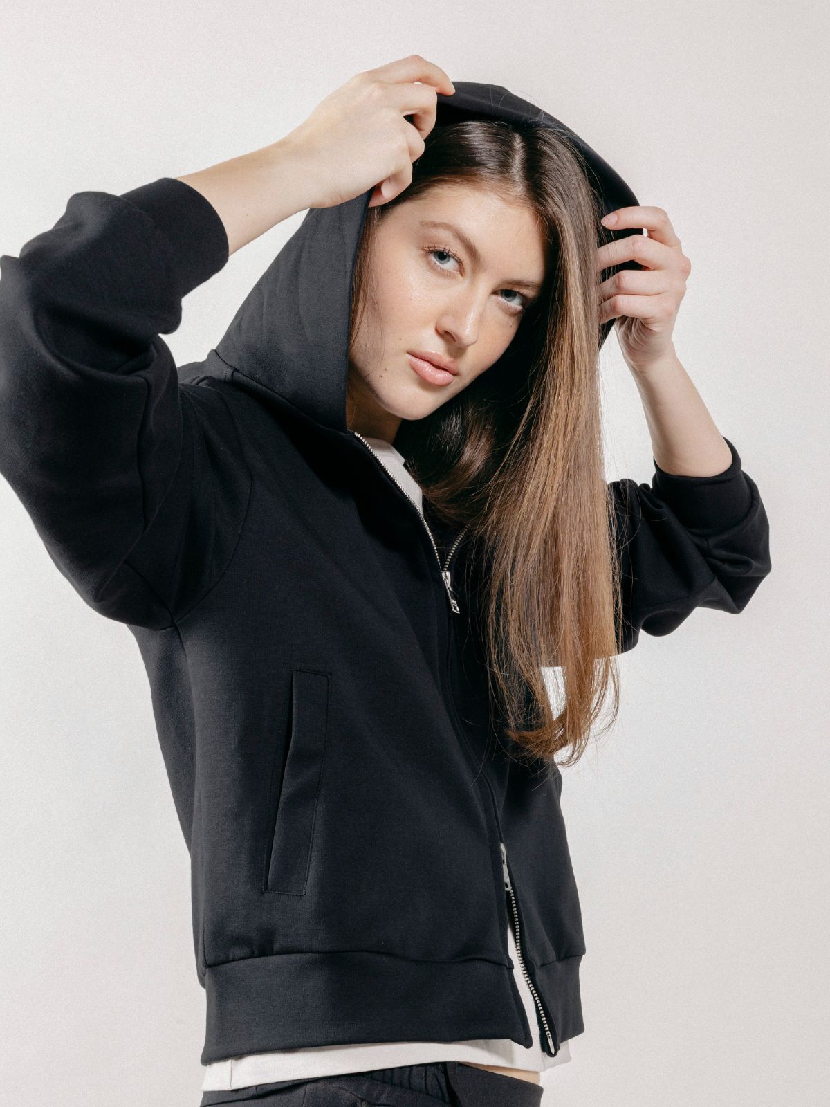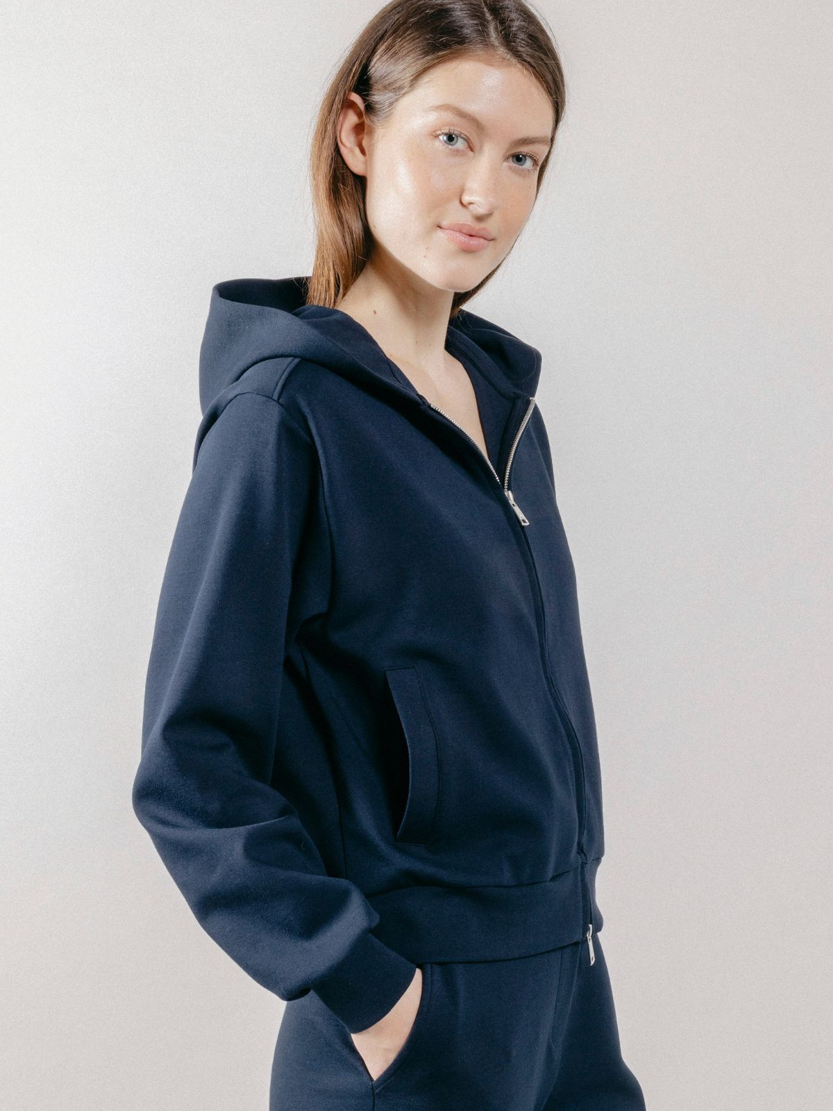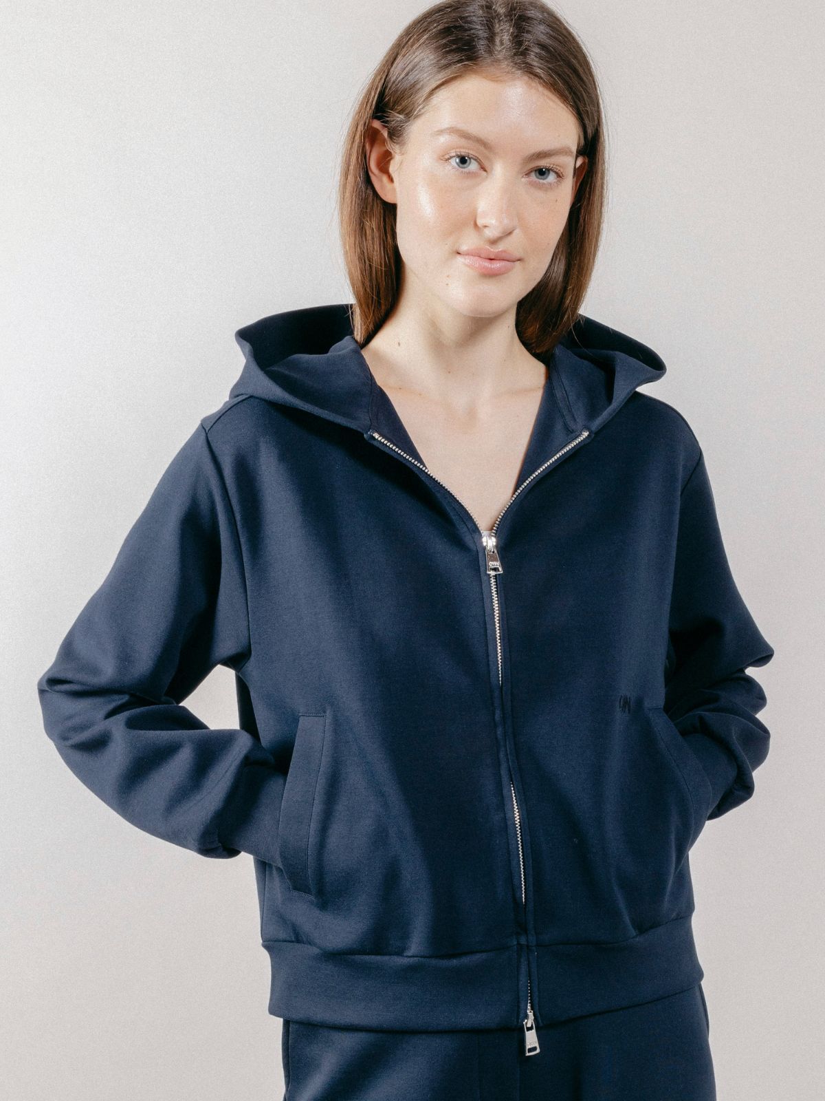 Felpa con cappuccio realizzata in interlock, con chiusura frontale a zip con doppio cursore e tasche laterali.