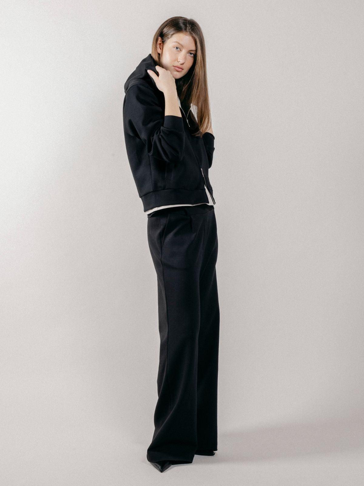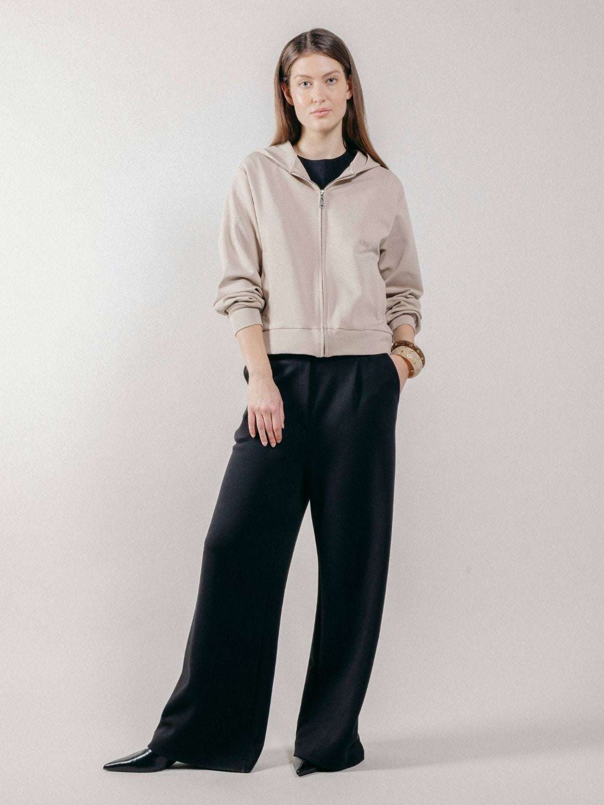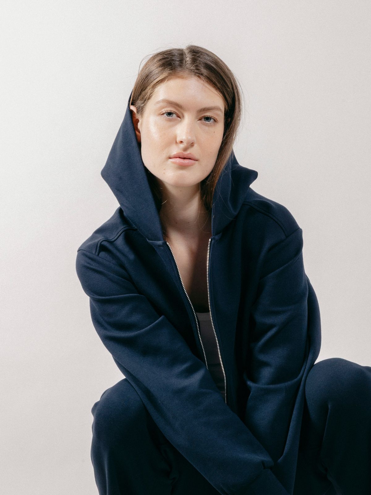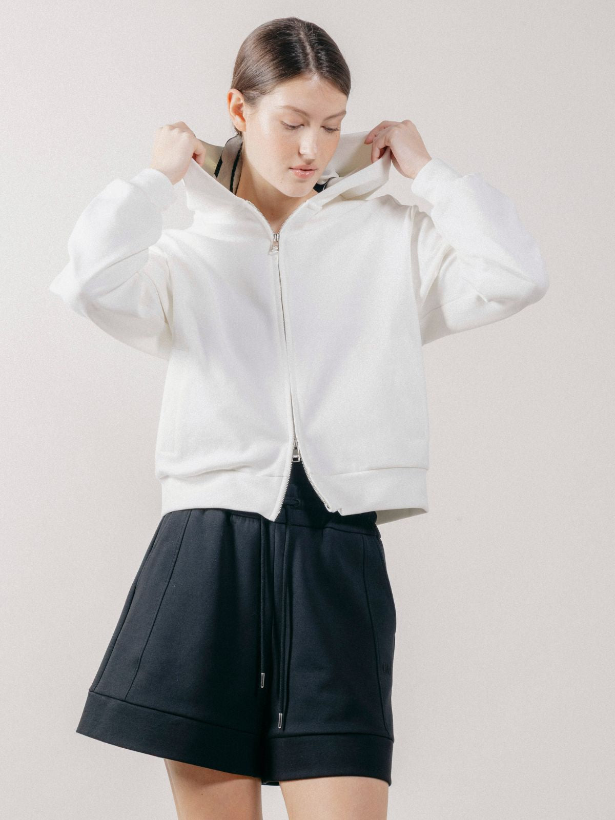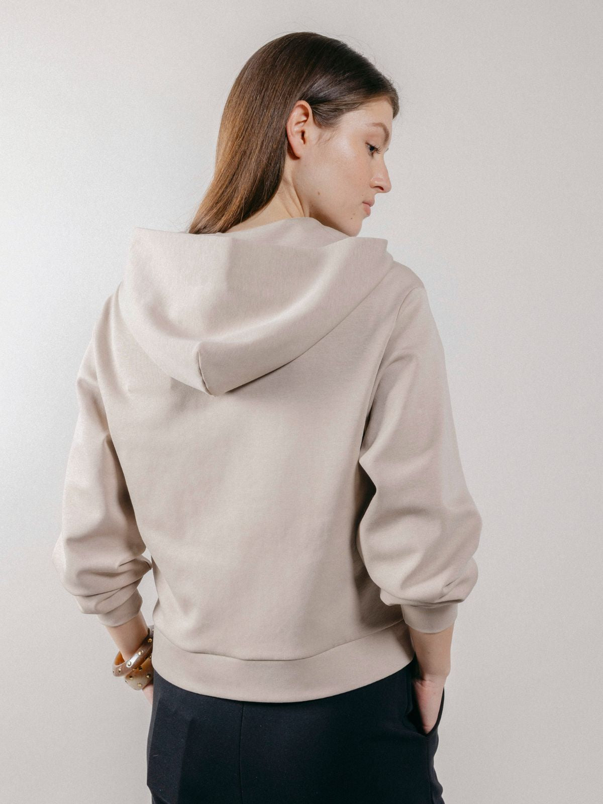 Felpa con cappuccio realizzata in interlock, con chiusura frontale a zip con doppio cursore e tasche laterali.