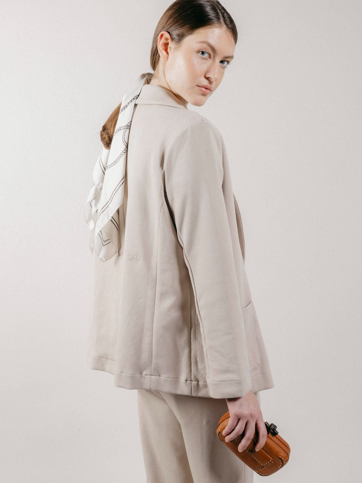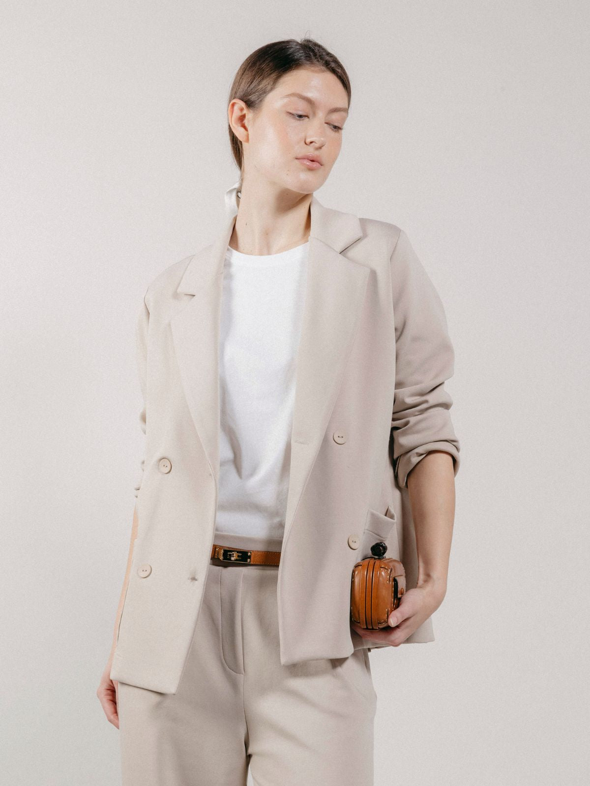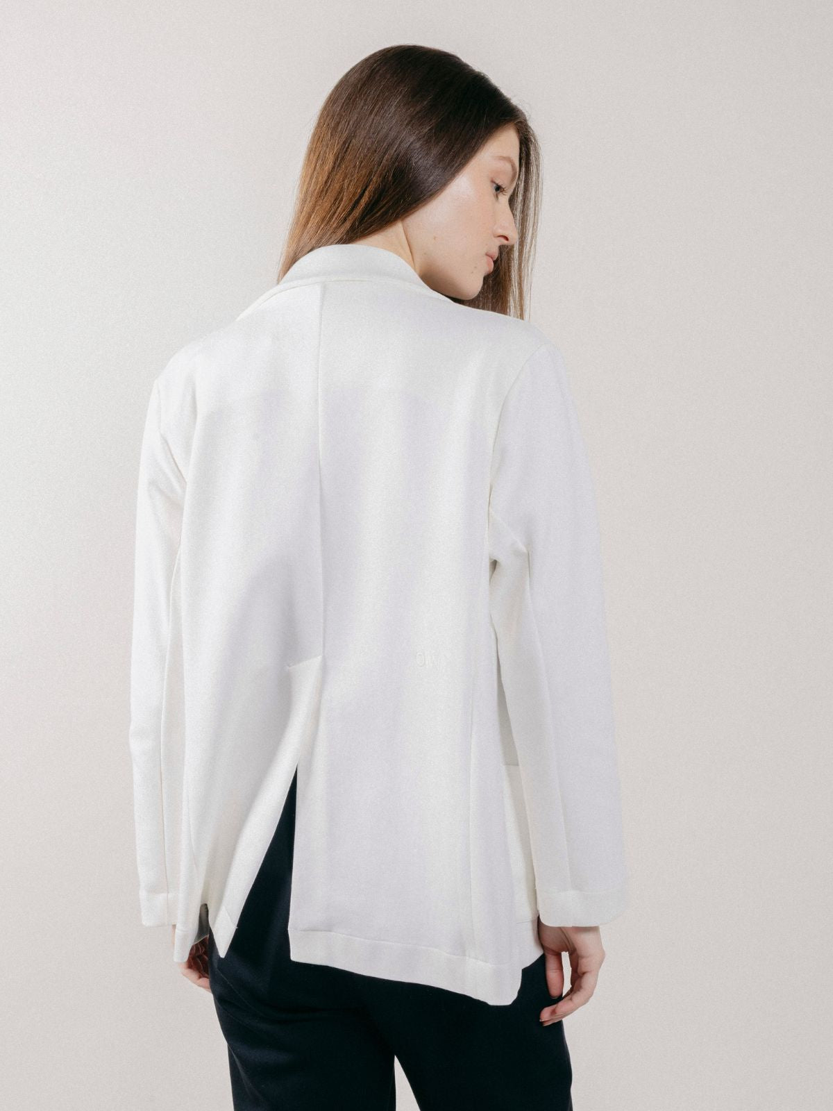 Giacca blazer doppiopetto da donna realizzato in interlock, con tasche applicate sul davanti e lungo spacco sul retro.