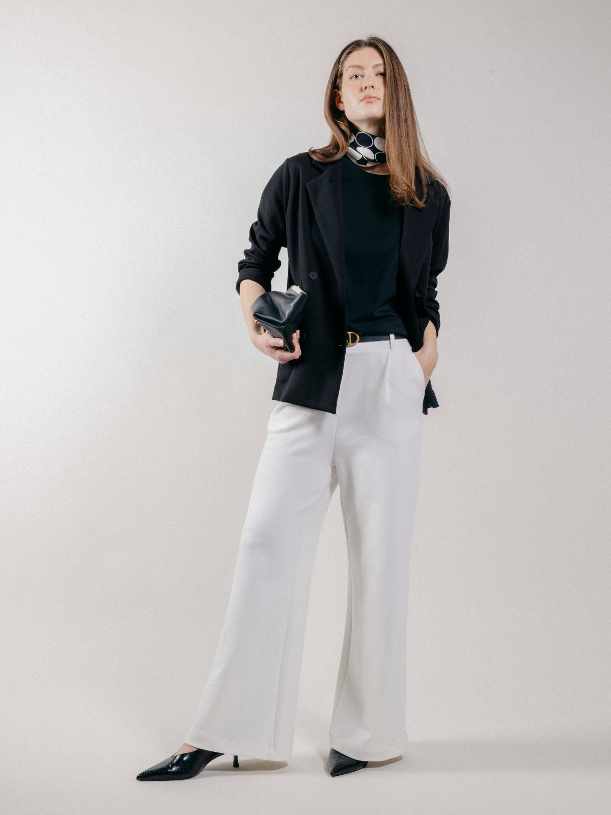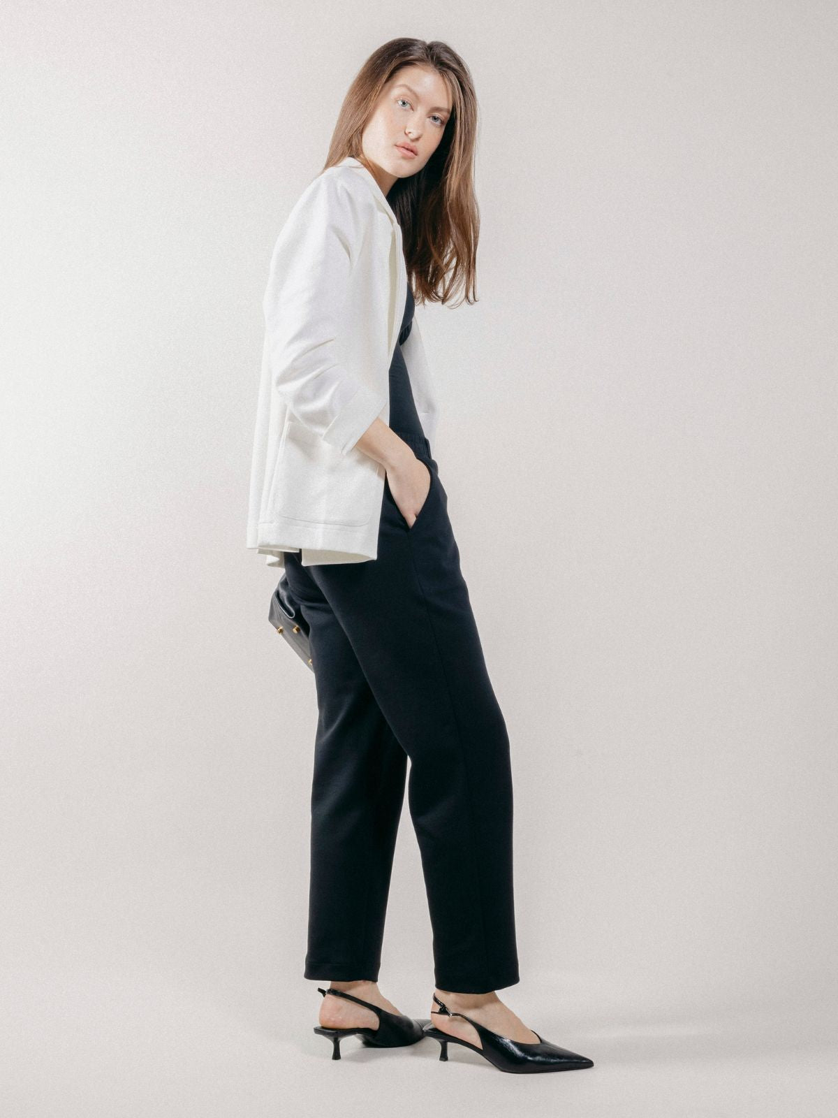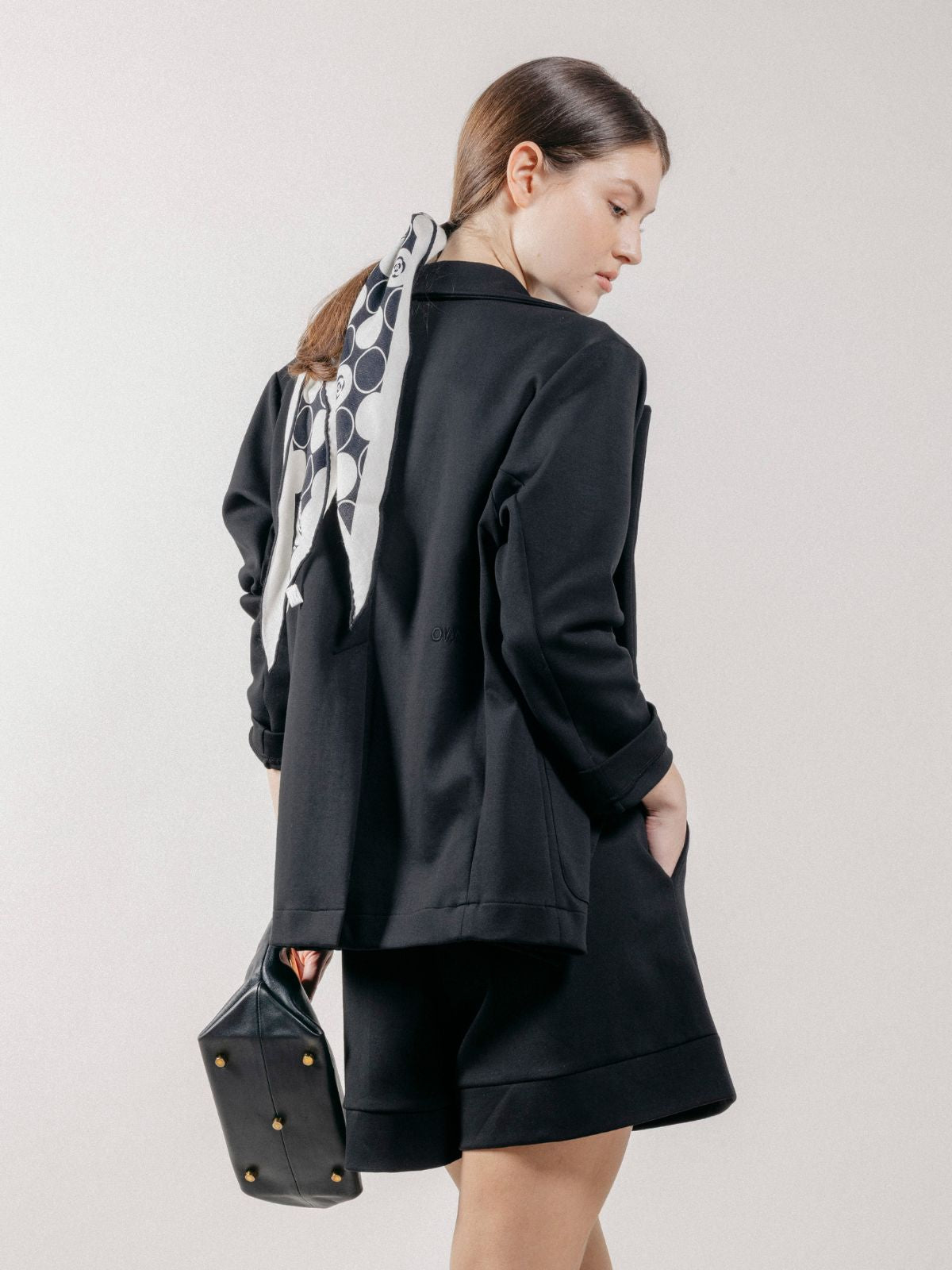 Giacca blazer doppiopetto da donna realizzato in interlock, con tasche applicate sul davanti e lungo spacco sul retro.